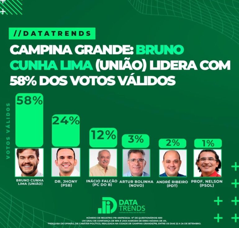 A pesquisa do Instituto DataTrends, divulgada nesta sexta-feira (27), aponta o prefeito de Campina Grande e candidato à reeleição, Bruno Cunha Lima (União Brasil), na liderança. Ele surge com 58% dos votos válidos, superando, portanto, a soma dos demais cinco candidatos que estão na disputa. Na contabilidade dos votos válidos, não são considerados brancos e nulos.