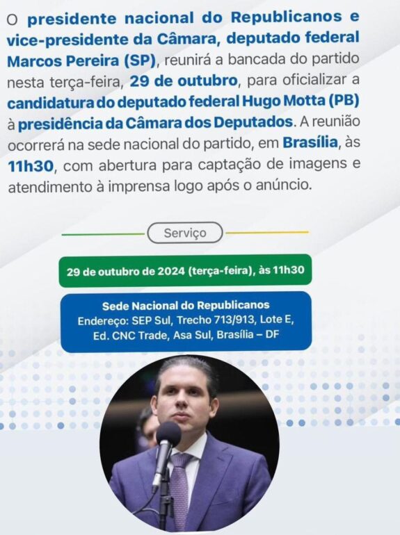 Veja abaixo a confirmação do evento para oficializar Hugo Motta candidato à presidência da Câmara: