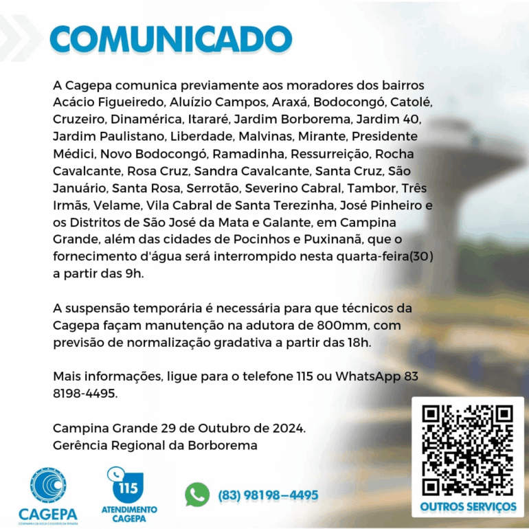 A Companhia de Água e Esgotos da Paraíba (Cagepa) informou hoje (29) que faltará água em diversos bairros de Campina Grande e também nas cidades de Pocinhos e Puxinanã. O abastecimento de água será interrompido por volta das 9h desta quarta-feira (30).