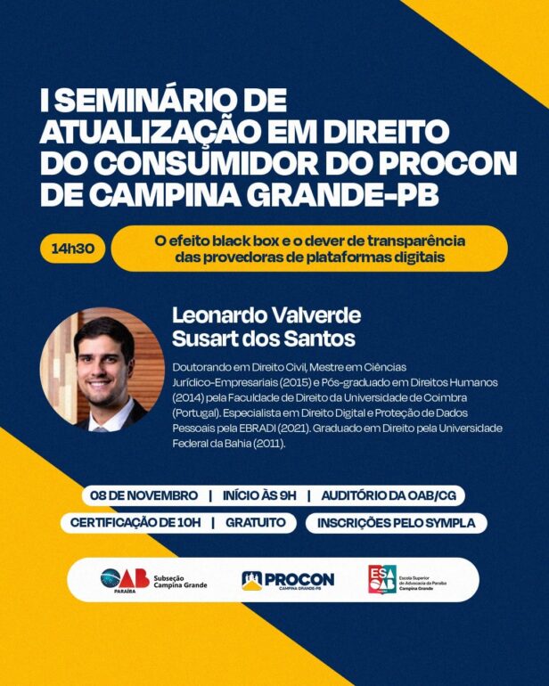 No período da tarde, estão previstas mais três palestras. A primeira será realizada às 14h30, com o tema: “O efeito black box e o dever de transparência das provedoras de plataformas digitais”, com o especialista em Direito Digital e Proteção de Dados Pessoais pela EBRADI, Leonardo Valverde Susart dos Santos. Logo após, será a vez da segunda palestra “A indústria do mero aborrecimento e a desconstrução do padrão civilizatório nas relações de consumo”, às 15h30, com o advogado Felipe Comarela Milanez, professor Associado do Departamento de Direito da Universidade Federal de Ouro Preto (UFOP).