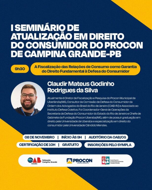 A Prefeitura de Campina Grande vai realizar o I Seminário de Atualização em Direito do Consumidor. Promovido pelo Procon de Campina Grande, o evento acontecerá no próximo dia 8, das 9h às 18h, no auditório da Subseção da Ordem dos Advogados do Brasil (OAB), no Catolé. O evento conta com o apoio da OAB, é aberto ao público e as inscrições gratuitas podem ser realizadas na plataforma Sympla, através do link: https://www.sympla.com.br/evento__2709074