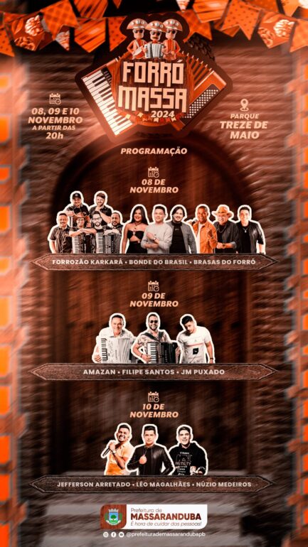 A programação do Forró Massa contará com diversas atrações de renome regional, prometendo animar o público ao longo de três dias de festividades.