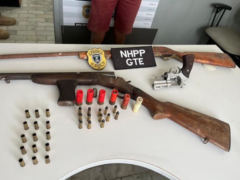 Durante a prisão, foram encontrados com ele duas armas de fogo, sendo um revólver e uma espingarda calibre 12, além de munições.