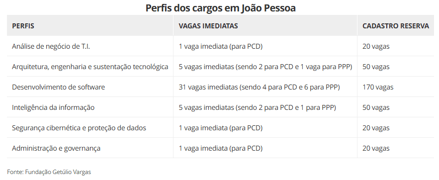 Em João Pessoa, as vagas são para o cargo de analista de tecnologia da informação, distribuídas nos perfis: