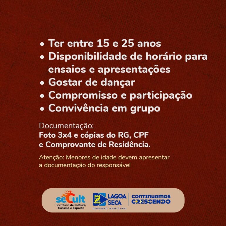 A Secretaria de Cultura, Turismo e Esporte iniciou mais um novo projeto em Lagoa Seca. A pasta pretende formar o “Grupo Folclore Tarimba”, para jovens de 15 a 25 anos.
