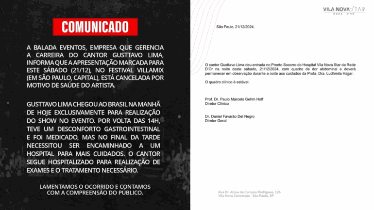 Porém, durante a tarde, ele sentiu um desconforto gastrointestinal e, mesmo medicado, precisou ser encaminhado para um hospital, onde realizou exames e passou a noite em observação. De acordo com o boletim médico emitido pelo Hospital Vila Nova Star, ainda na noite de sábado, o quadro de saúde de Gusttavo é considerado estável.