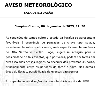 De acordo com o comunicado, cidades como Cajazeiras e Itaporanga devem registrar pancadas de até 50 mm/dia, além da possibilidade de ventos intensos entre 40 e 60 km/h.