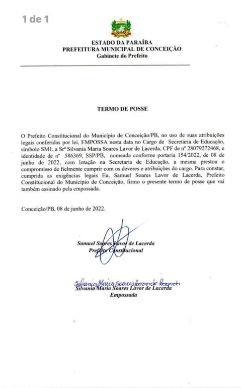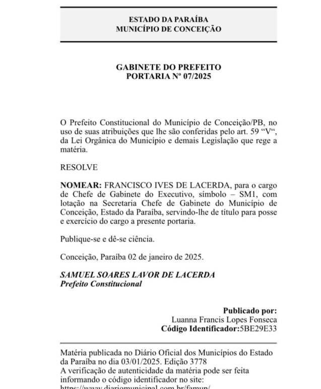 Samuel Lacerda, prefeito reeleito em Conceição (Sertão paraibano), decidiu nomear os pais e a própria esposa para ocuparem cargos públicos no município.