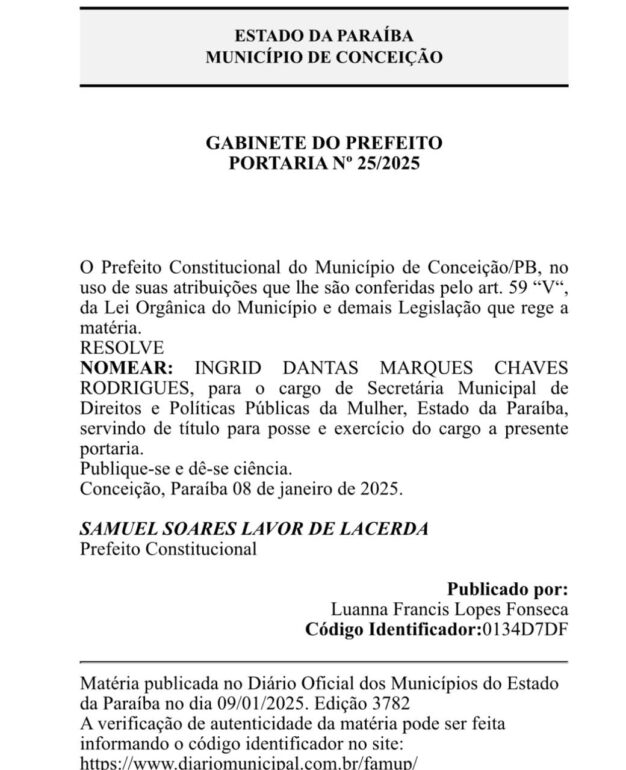 Já Ingrid Dantas, esposa do prefeito, foi nomeada para gerenciar a Secretaria Municipal de Direitos e Políticas Públicas da Mulher. A portaria que oficializou a nomeação foi publicada no dia 8 de janeiro de 2025.