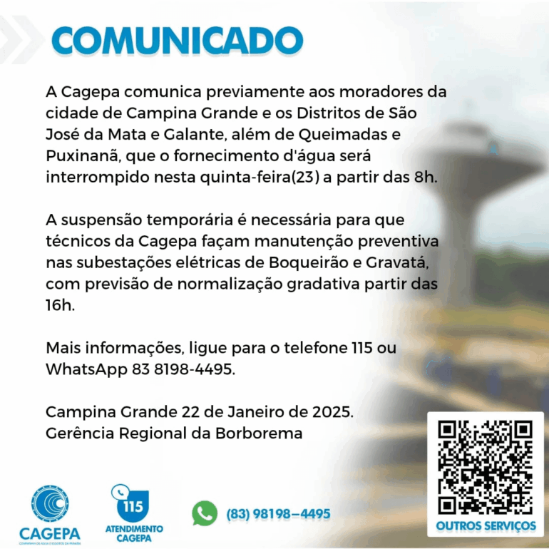 A Cagepa informa aos moradores de Campina Grande, dos distritos de São José da Mata e Galante, além das cidades de Queimadas e Puxinanã, que o fornecimento de água será interrompido nesta quinta-feira (23), a partir das 8h. A suspensão temporária é necessária para a realização de manutenção preventiva nas subestações elétricas de Boqueirão e Gravatá. A previsão é de que o serviço seja normalizado gradativamente a partir das 16h.