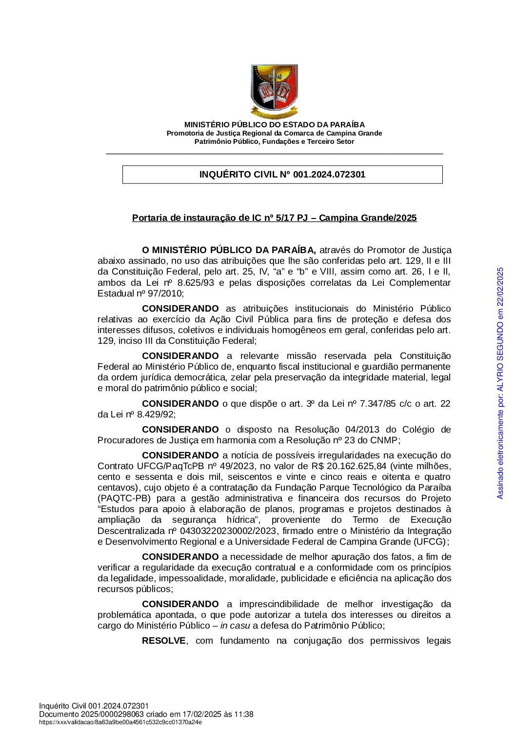 O Ministério Público do Estado da Praíba (MPPB) Investiga instaurou um Inquérito Civil para investigar possíveis irregularidades na execução do Contrato UFCG/PAQTC-PB nº 49/2023, que envolve a quantia de R$ 20.162.625,84. O objeto do contrato é a gestão administrativa e financeira feita pela Fundação Parque Tecnológico da Paraíba (PAQTC-PB) dos recursos do Projeto “Estudos para apoio à elaboração de planos, programas e projetos destinados à ampliação da segurança hídrica”, firmado entre o Ministério da Integração e Desenvolvimento Regional e a Universidade Federal de Campina Grande (UFCG).