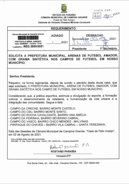 “Agora fiquei informado que a primeira arena sairá, no Severino Cabral, é importante que realmente aconteça e possibilite o uso a escolinhas e times amadores de Campina Grande, inclusive fruto do meu mandato, o governo estadual, através do próprio governador João Azevedo irá construir no Campo do CSU no Monte Santo, e vamos lutar por mais”, frisou o vereador.