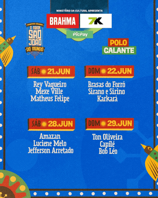 O evento será iniciado no dia 7 de junho e se estenderá até o dia 6 de julho, durando 5 finais de semana. Entre os artistas confirmados estão alguns nomes que também foram anunciados para o São João no Parque do Povo, como Amazan, Karkará, Ranniery Gomes, Capilé, entre outros.