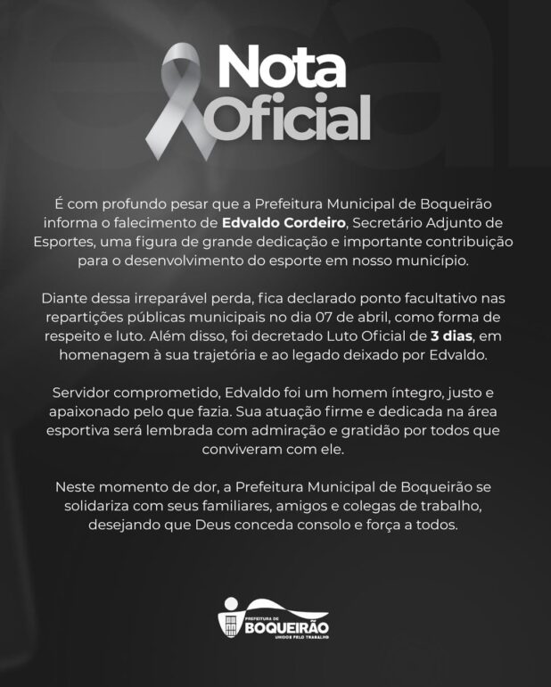 A Prefeitura de Boqueirão lamentou, em nota, a morte do secretário adjunto de Esportes, Edvaldo Cordeiro, assassinado a tiros na noite deste domingo (6), enquanto participava de uma confraternização com amigos. Edvaldo foi atingido por cinco disparos e morreu no local. A cidade, no Cariri paraibano, está em choque com o crime.