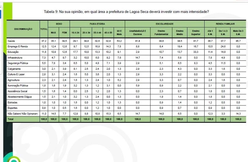 A pesquisa foi feita no último dia 07 de abril e ouviu 400 moradores de Lagoa Seca, de idade entre 16 e 65 anos em todas as regiões do município.