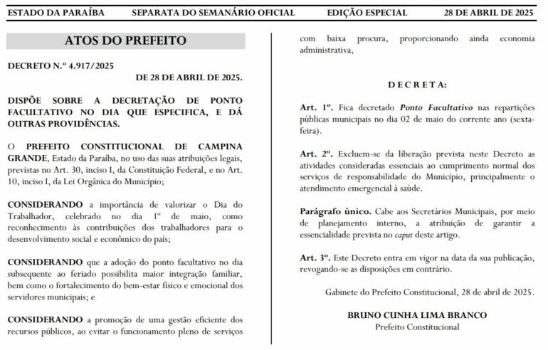 As cidades de Campina Grande e Lagoa Seca decretam ponto facultativo na próxima sexta-feira (02). A data sucede o feriado do dia do trabalho.