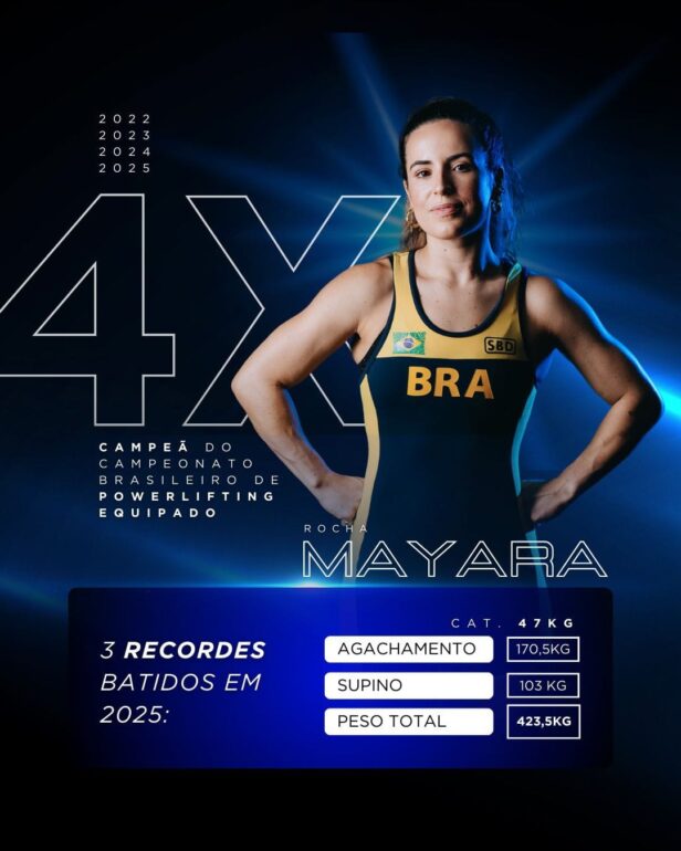 A atleta paraibana Mayara Rocha teve uma performance considerada excelente no Campeonato Brasileiro de Powerlifting Equipado, após sagrar-se campeã pela quarta vez seguida, na categoria de peso corporal até 47 kg. A competição foi encerrada no último dia 1º de maio, em São Paulo.