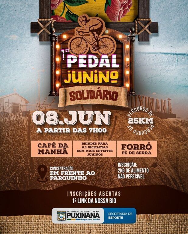 A Prefeitura de Puxinanã, por meio da Secretaria Municipal de Esportes, promove no dia 8 de junho o 1º Pedal Junino Solidário. A concentração será às 7h, em frente ao parquinho, e o percurso terá 25 km.