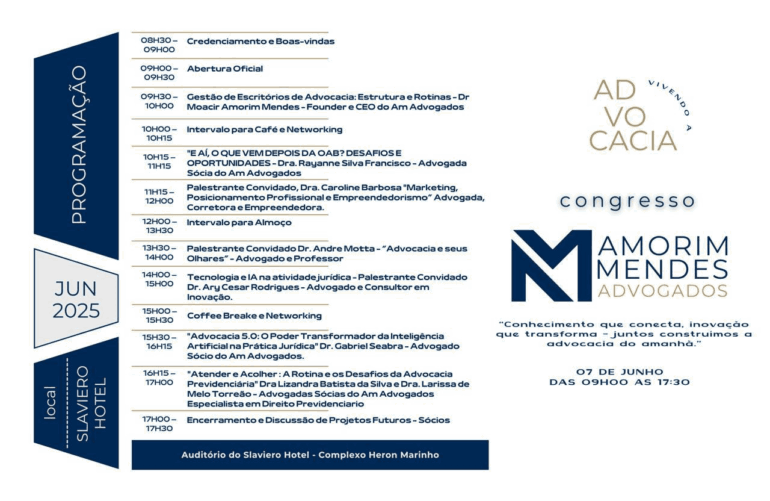 No dia 07 de junho de 2025, o escritório Amorim Mendes Advogados promoverá um congresso exclusivo com o tema “Vivendo a Advocacia”, reunindo profissionais e especialistas da área para discutir os desafios, inovações e o futuro da atuação jurídica. O evento contará com a participação dos juristas Moacir Amorim Mendes (CEO escritório AM advogados), Rayanne Silva Francisco, Caroline Barbosa, Andre Motta, Ary Cesar Rodrigues, Gabriel Seabra, Lizandra Batista da Silva e Larissa de Melo Torreão.
