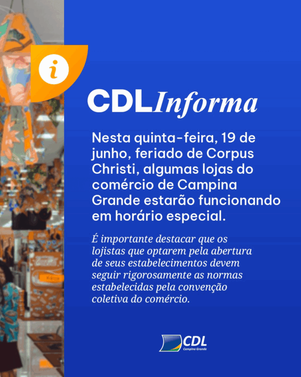 Nesta quinta-feira, 19 de junho, feriado de Corpus Christi, algumas lojas do comércio de Campina Grande estarão funcionando em horário especial. Essa iniciativa oferece aos consumidores a oportunidade de realizar suas compras e se preparar para a semana do São João.