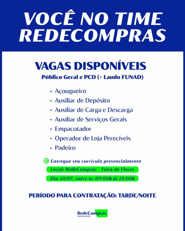 A RedeCompras Supermercados está com vagas de emprego abertas para contratação imediata em Campina Grande. As oportunidades são voltadas para o público geral e também para pessoas com deficiência (PCD), mediante apresentação de laudo da FUNAD.