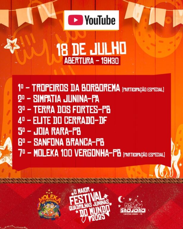 O evento é uma realização da Moleka 100 Vergonha, uma das quadrilhas mais premiadas do Brasil, reconhecida como ponto de cultura e patrimônio cultural, e conta com patrocínio do YouTube, por meio da Lei de Incentivo à Cultura (Lei Rouanet). Toda a programação será transmitida ao vivo pelo canal oficial do evento no YouTube, levando o brilho das quadrilhas juninas a espectadores de todo o país e do mundo.