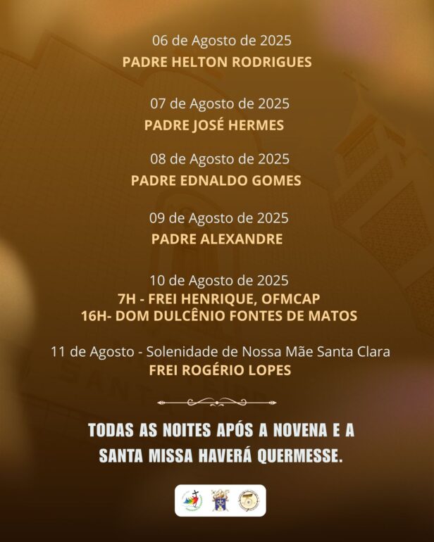 As celebrações deste momento festivo acontecerão diariamente às 19h, com novenas, missas celebradas por padres e freis convidados, e ao final de cada noite, uma tradicional quermesse, com comidas típicas e apresentações culturais. No dia 10, a programação contará com missa celebrada por Dom Dulcênio Fontes de Matos e, no dia 11, a celebração de encerramento da festa será conduzida pelo Frei Rogério Lopes.