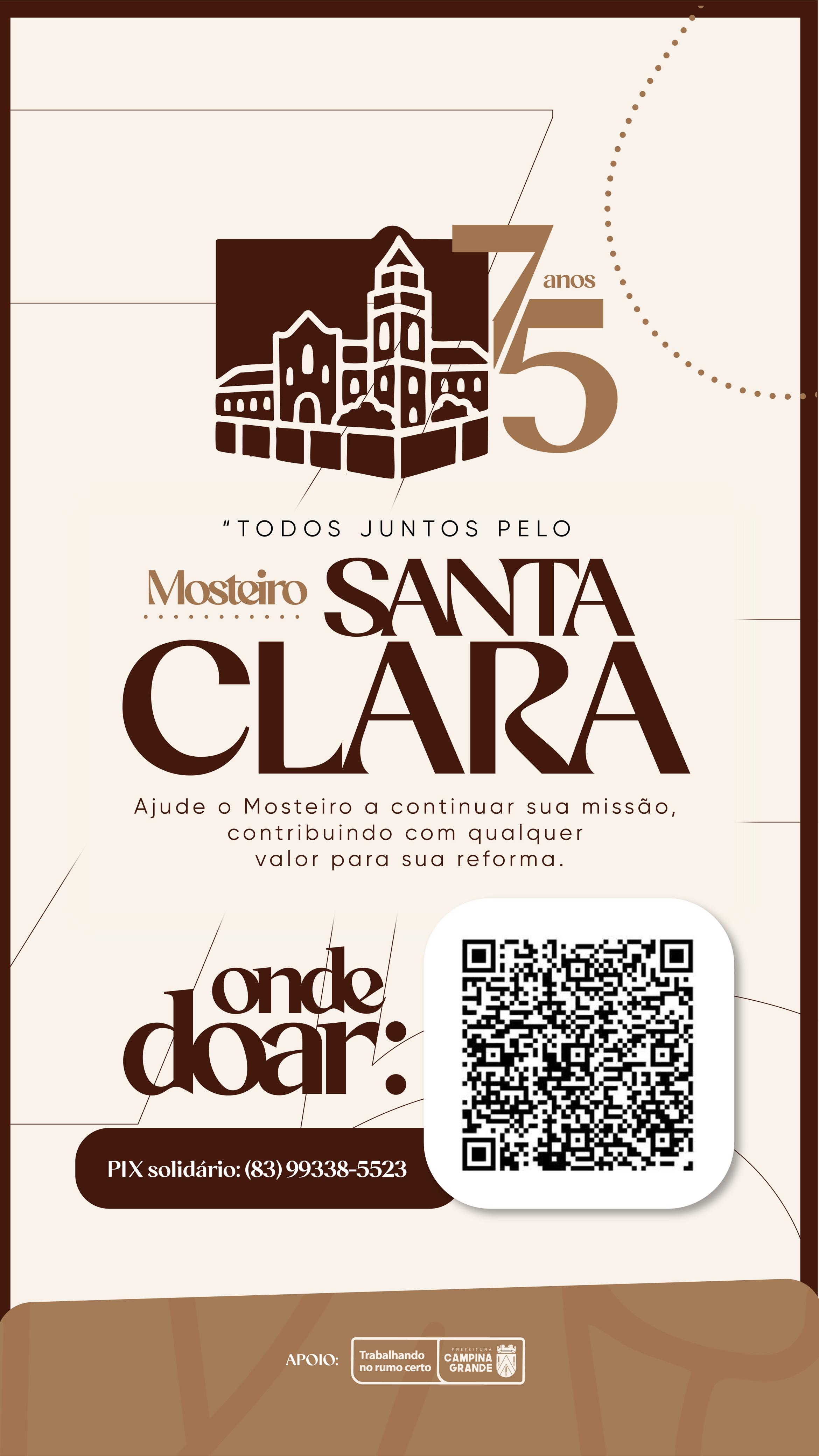 As doações para a reforma do Mosteiro Santa Clara podem ser feitas para a chave-pix 83 99338 5523 ou presencialmente. Mais informações estão disponíveis no perfil oficial do Mosteiro no Instagram: @mosteiro_santaclara.