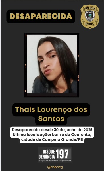 Thaís Lourenço dos Santos, moradora de Solânea, no Agreste paraibano, está desaparecida desde 30 de junho. Segundo a Polícia Civil, a jovem foi vista pela última vez no Parque do Povo, durante os festejos juninos de Campina Grande. Há relatos de que ela também teria passado pelo bairro Quarenta.