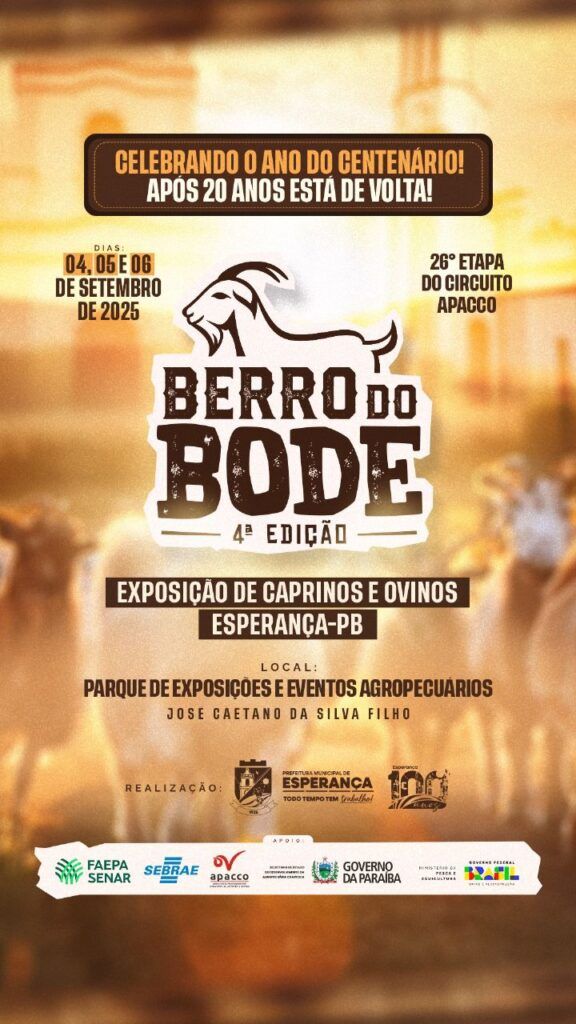No ano em que comemora 100 anos de emancipação, o município de Esperança vai celebrar a retomada de uma de suas tradições mais marcantes. Após duas décadas, a Feira Berro do Bode volta a integrar o calendário de eventos da cidade, realizando sua 4ª edição de 4 a 6 de setembro, dentro da 26ª etapa do Circuito APACCO.