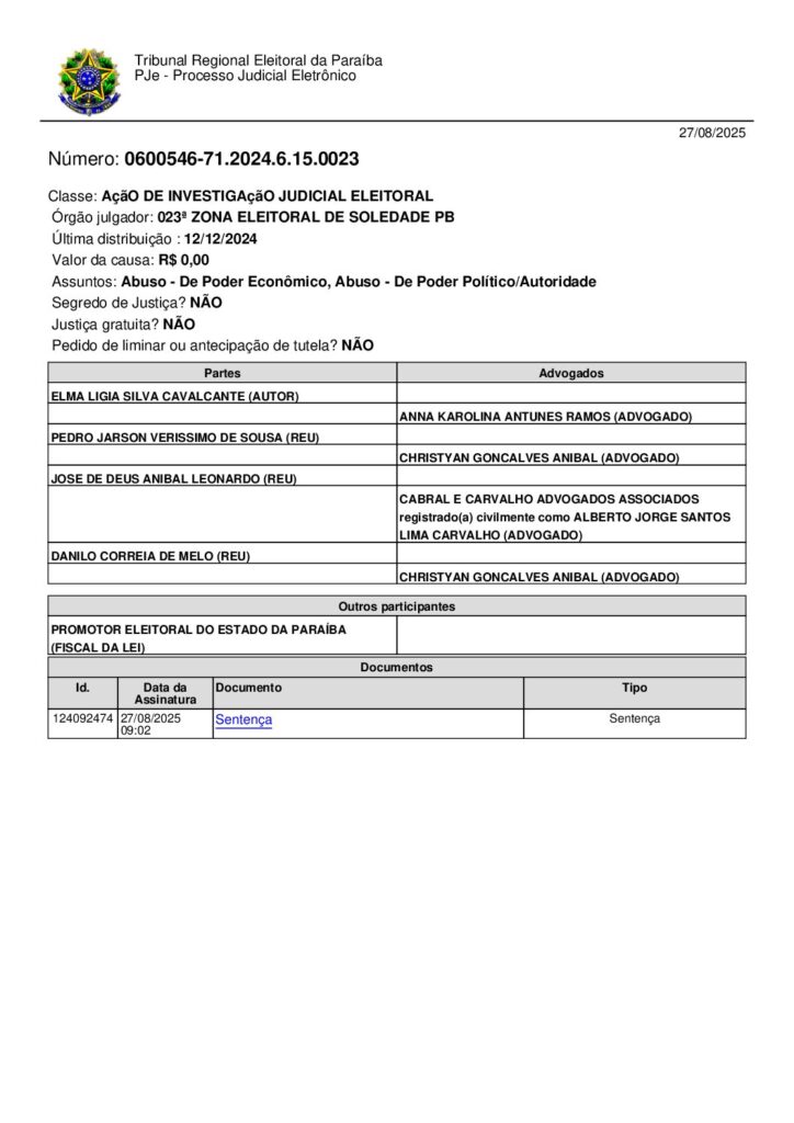A Justiça Eleitoral da 23ª Zona, em Soledade, julgou improcedente a Ação de Investigação Judicial Eleitoral (AIJE) movida contra o prefeito eleito de Olivedos, Pedro Jarson Veríssimo de Sousa, e o vice, Danilo Correia de Melo, garantindo a validade do resultado das eleições municipais de 2024. A decisão foi assinada nesta quarta-feira (27) pela juíza eleitoral Andreia Silva Matos .