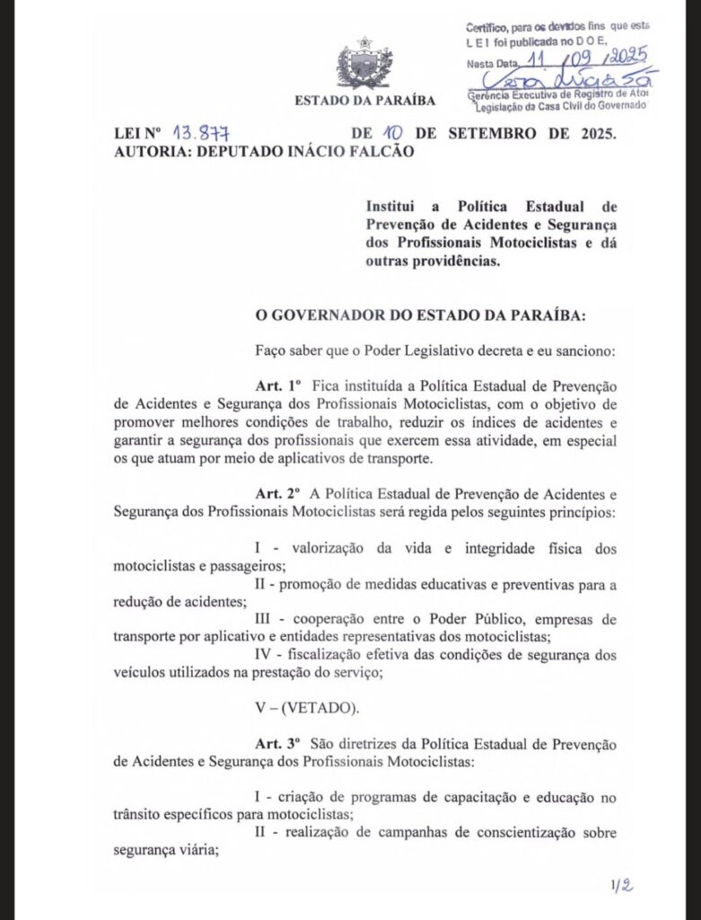O projeto de lei 3716/2025 aprovado na Assembléia Legislativa da Paraíba, de autoria do deputado estadual Inácio Falcão(PCdoB), instituí uma política estadual de prevenção a acidentes e segurança dos motociclistas profissionais. A propositura tem o objetivo de garantir melhores condições de segurança viária e de trabalho a que utiliza a motocicleta como ferramenta de trabalho, desempenhando as mais diversas atividades no transporte de pessoas e objetos diariamente.