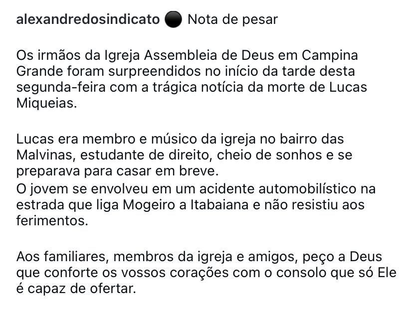 ”A Igreja Evangélica Assembleia de Deus em Campina Grande manifesta seu profundo pesar pelo falecimento do jovem Lucas Rocha, membro da IEAD-CGPB. Rogamos a todos os irmãos que interceda para que o Espírito Santo conforte todos os familiares e amigos.