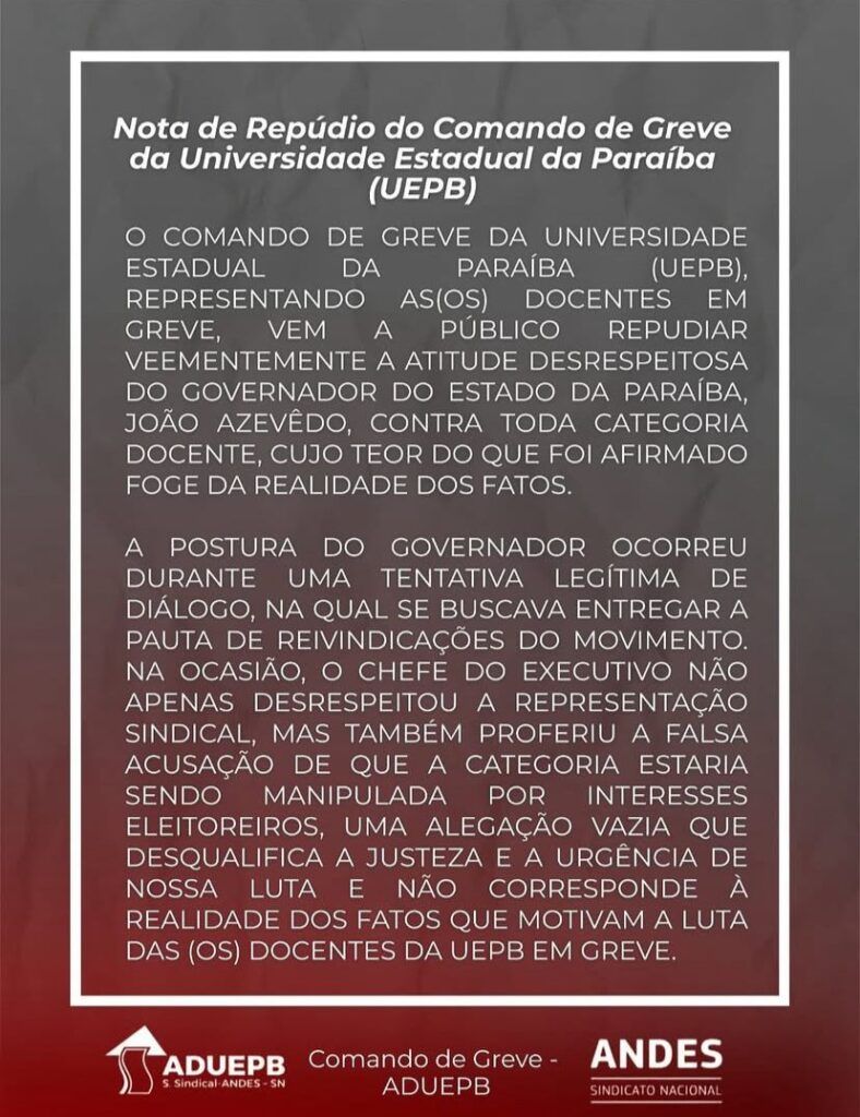 O Comando de Greve da Universidade Estadual da Paraíba (UEPB) divulgou, neste sábado (18), uma nota de repúdio contra declarações feitas pelo governador João Azevêdo. O texto, publicado pela Associação dos Professores da UEPB (ADUEPB), expressa insatisfação com o posicionamento do chefe do Executivo estadual após uma tentativa de diálogo ocorrida na última segunda-feira (13), durante agenda do governador em Campina Grande.