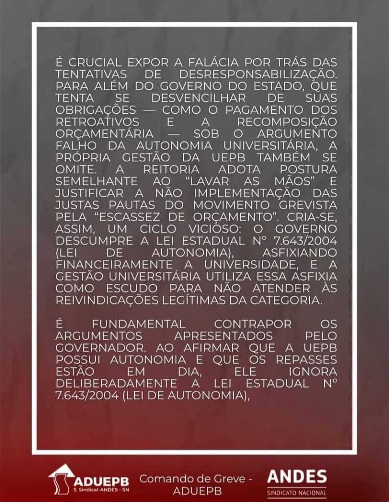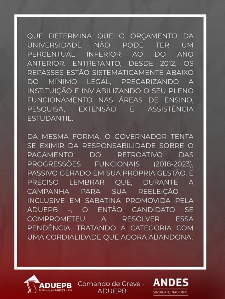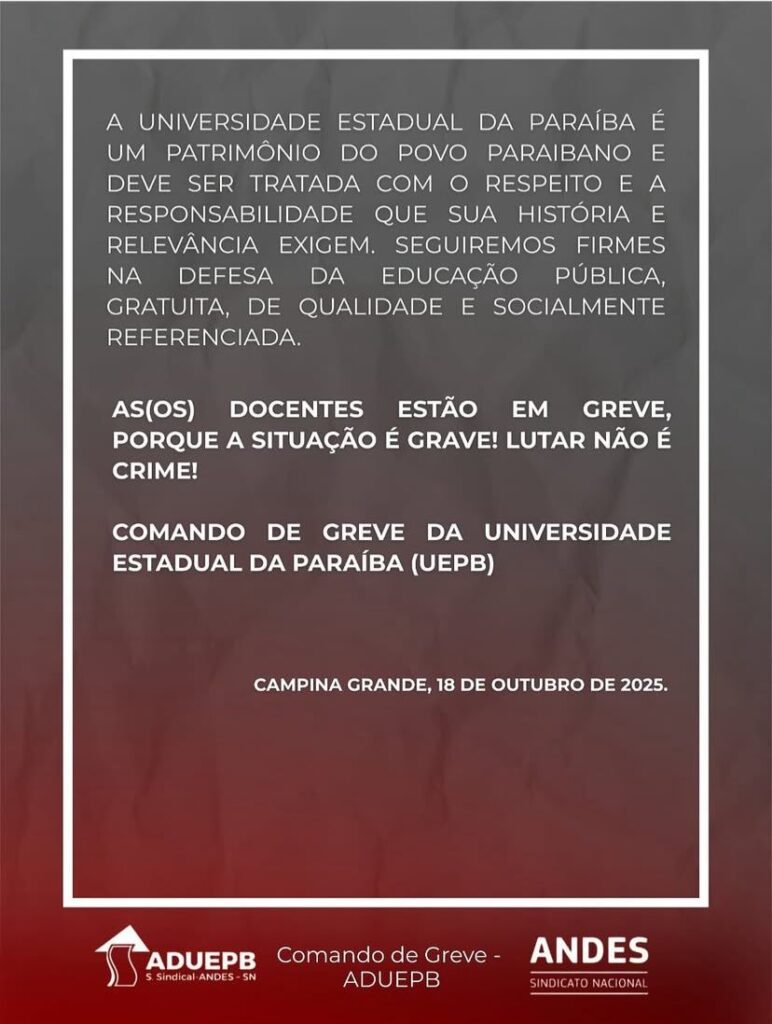 Em nota, o Comando de Greve destacou que as reivindicações da categoria são históricas e independem do calendário político. O grupo reforçou que a paralisação é resultado da ausência de avanços nas negociações e reafirmou a disposição para o diálogo, desde que haja compromisso efetivo do governo com as demandas apresentadas pelos professores da UEPB.