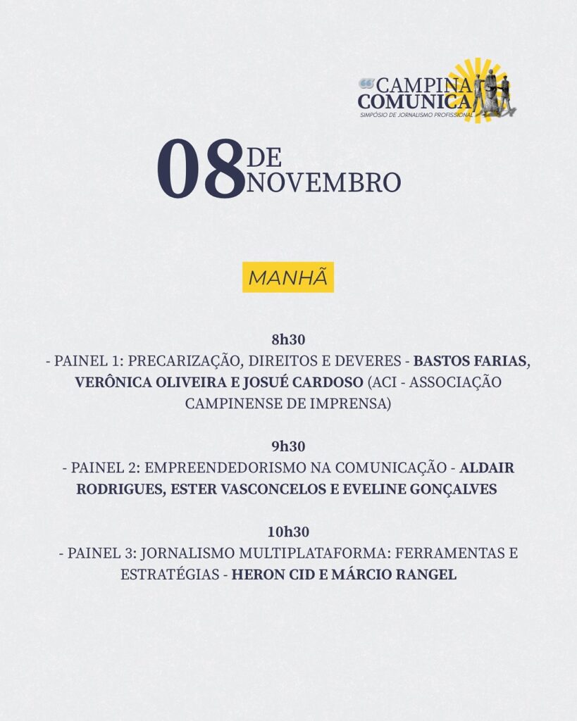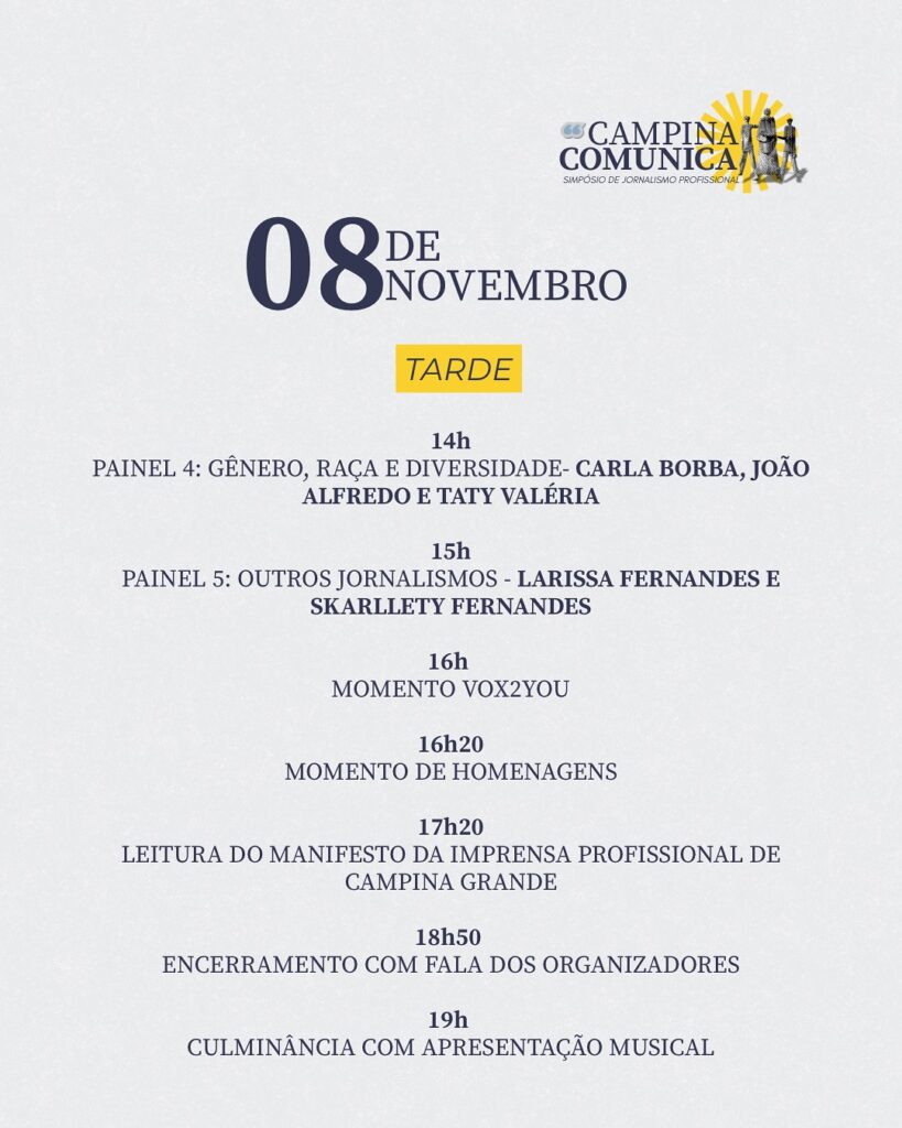No dia 8 de novembro, as atividades começam às 8h30 com painéis sobre Precarização e Direitos Trabalhistas, Empreendedorismo na Comunicação e Jornalismo Multiplataforma. À tarde, os debates seguem com temas como Gênero, Raça e Diversidade e Outros Jornalismos. Haverá ainda homenagem a profissionais da imprensa campinense, leitura de um manifesto em defesa do jornalismo local e apresentações artísticas de encerramento.