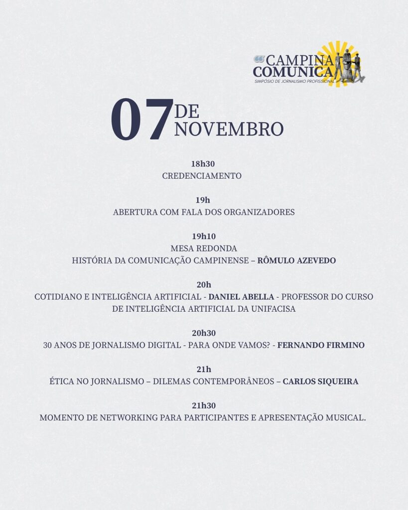 A abertura será na noite do dia 7 de novembro, com credenciamento a partir das 18h30. A programação contará com mesa redonda sobre a História da Comunicação Campinense (com Rômulo Azevêdo), seguida de debates sobre Inteligência Artificial no Cotidiano, 30 anos de Jornalismo Digital e Ética no Jornalismo. O primeiro dia será encerrado com um momento de networking e apresentação musical.
