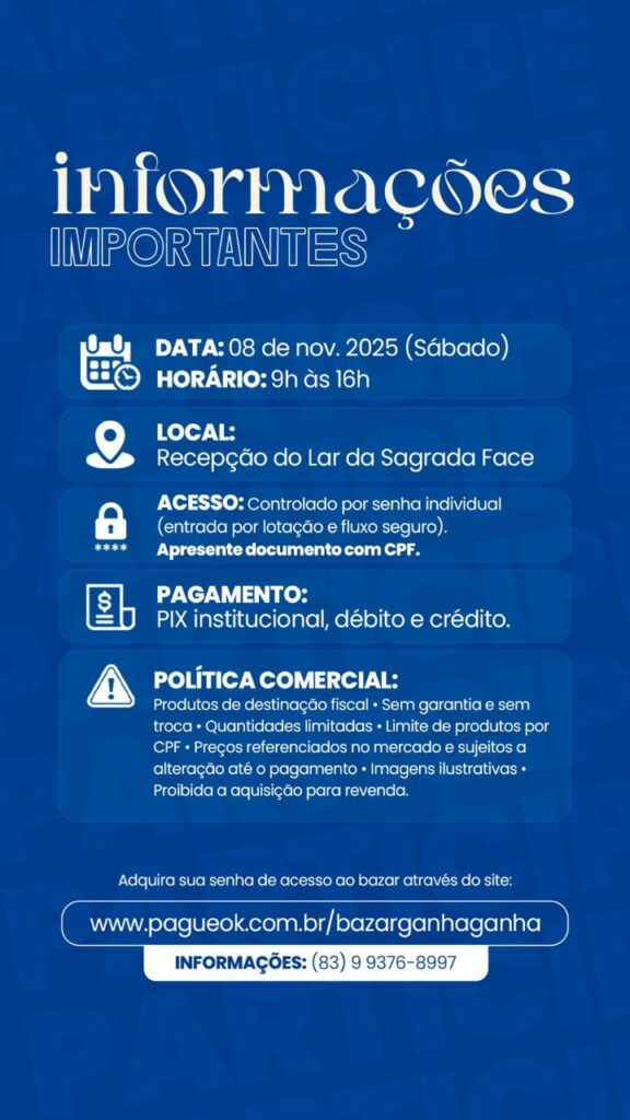 No dia 08 de novembro, das 9h às 16h, o Lar da Sagrada Face vai sediar o Bazar Solidário Ganha Ganha, um evento feito de propósito, solidariedade e responsabilidade social. A ação acontecerá na recepção da Instituição e contará com a venda de produtos novos apreendidos pela Receita Federal do Brasil (RFB), com preços sociais (em média 50% abaixo do valor de mercado). Adquira a senha de acesso através do site www.pagueok.com.br/bazarganhaganha
