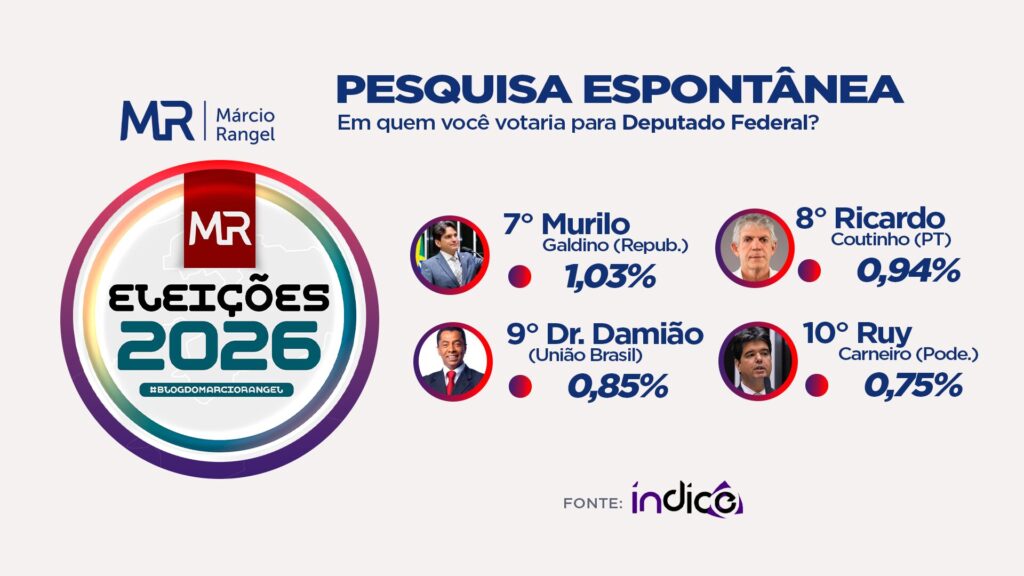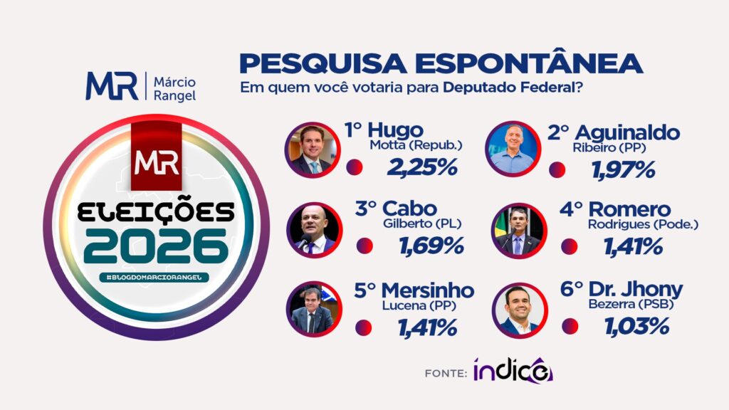 Os deputados Hugo Motta (Republicanos), Aguinaldo Ribeiro (PP) e Cabo Gilberto Silva (PL) aparecem nas primeiras posições das intenções de voto para deputado federal na Paraíba, segundo pesquisa realizada pelo Instituto Índice em parceria exclusiva com o Blog do Márcio Rangel.