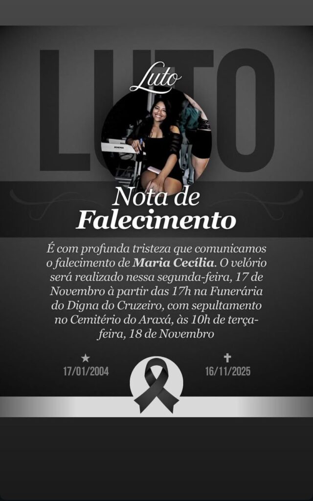 O corpo da jovem Maria Cecília, que foi morta pelo namorado neste domingo (16) em João Pessoa/PB, estará sendo velado a partir das 17h de hoje (17), na Funerária do Digna do Cruzeiro, em Campina Grande/PB. O sepultamento está marcado para às 10h de terça-feira (18), no Cemitério do Araxá, também na Rainha da Borborema.