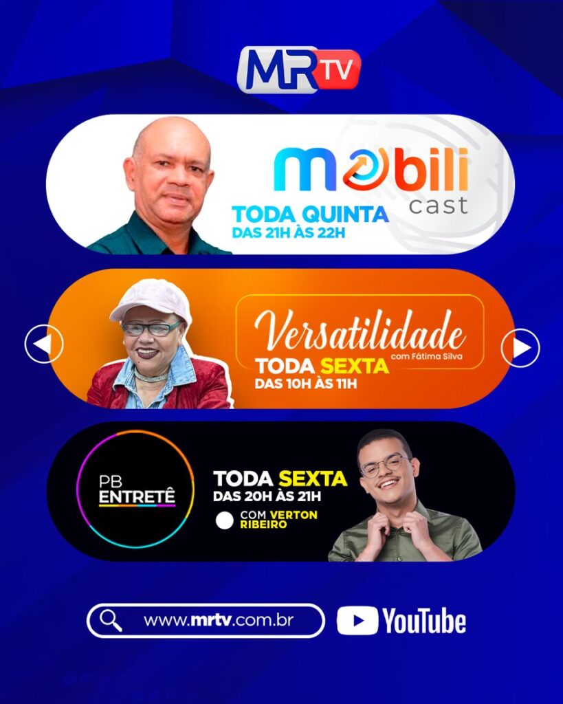 A grade também contempla podcasts temáticos voltados para sustentabilidade, saúde, comportamento e cultura. O MRCast Sustentabilidade – No Tom da Conversa vai ao ar toda quinta-feira, das 20h às 21h, enquanto o Mobilicast ocupa a quinta, das 21h às 22h. Já às sextas-feiras, a programação inclui o Versatilidade, das 10h às 11h, o PB Entretê agora, das 20h às 21h, e o MRCast Saúde, das 21h às 22h.