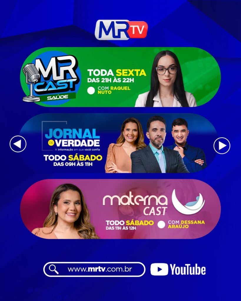 Aos sábados, a MRTV amplia a oferta de conteúdo com o Jornal de Verdade, das 9h às 11h, seguido do MaternaCast que estreia das 11h às 12h, e do MRCast Cultura, das 12h às 13h, reforçando o compromisso da emissora com informação, diversidade de temas e pluralidade de vozes.