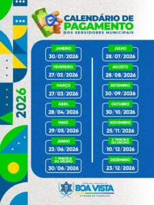 A Prefeitura Municipal de Boa Vista divulgou o calendário oficial de pagamento dos servidores públicos municipais referente ao ano de 2026. O cronograma estabelece datas fixas para o pagamento dos salários ao longo de todo o ano, garantindo previsibilidade, organização financeira e valorização do funcionalismo público.