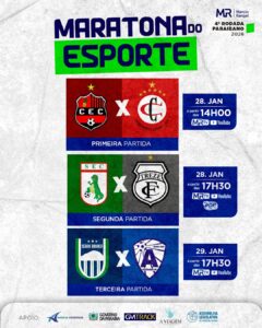 A quarta rodada do Campeonato Paraibano 2026 contará com uma ampla cobertura esportiva, com transmissões simultâneas que prometem movimentar o futebol do estado ao longo de dois dias. A Maratona do Esporte exibirá três partidas com transmissões ao vivo pela MRTV e Rádio Pop Cariri FM 101.1.