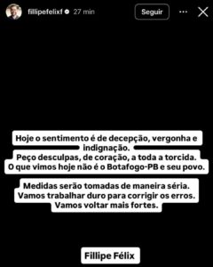 O dirigente utilizou as redes sociais para lamentar o desempenho da equipe e demonstrar insatisfação com a atuação em campo. Segundo ele, o sentimento após o jogo foi de decepção, vergonha e indignação. “Peço desculpas, de coração, a toda a torcida. O que vimos hoje não é o Botafogo-PB”, declarou.