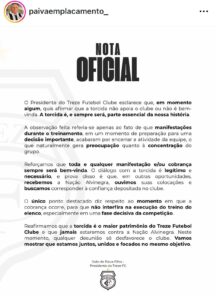 Horas depois, em sua nota oficial, Paiva ressaltou que a torcida é o maior patrimônio do time e disse que a diretoria aceitará a cobrança dos torcedores e que seguirá ouvindo as demandas dos trezeanosNo entanto, ele reafirmou que o horário de treino não seria o momento ideal para aquele tipo de cobrança. Confira a nota completa: