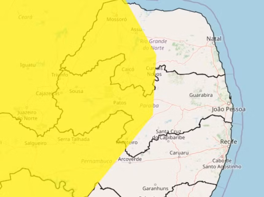Entre as cidades citadas no novo alerta estão municípios como Patos, Sousa, Cajazeiras, Monteiro e Pombal, além de outras localidades do Sertão, Cariri e Seridó paraibano.