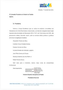 A direção nacional do União Brasil divulgou, nesta quarta-feira (1º), um documento que confirma as decisões tomadas pela executiva estadual, autorizando a desfiliação de cinco vereadores e um suplente do partido em Campina Grande.