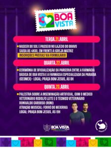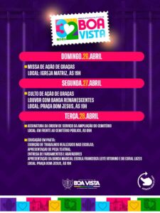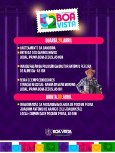 A cidade de Boa Vista se prepara para comemorar seus 32 anos de emancipação política com uma programação ampla e diversificada entre os dias 21 e 30 de abril. As atividades incluem ações institucionais, culturais, esportivas, religiosas e de prestação de serviços para a população.