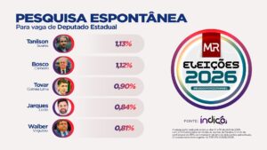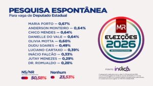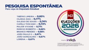 A pesquisa do Instituto Índice Inteligência apresenta um cenário ainda indefinido na disputa para deputado estadual na Paraíba, mesmo com a apresentação de nomes aos eleitores. O levantamento questionou: “Se as eleições para deputado estadual fossem hoje, em quem você votaria?” Na pesquisa estimulada, Wilson Filho, Felipe Leitão e Eduardo Carneiro aparecem na liderança, empatados com 1,52% das intenções de voto.